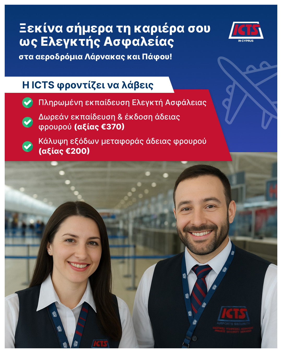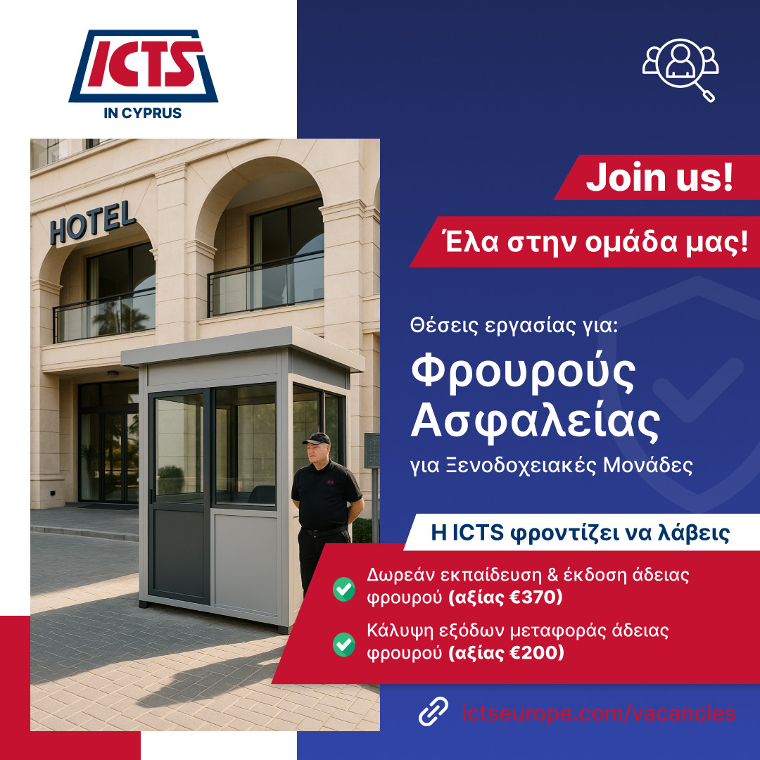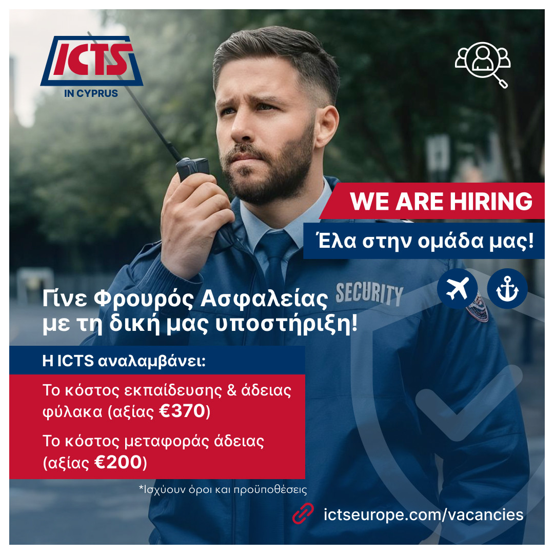 Λάρνακα, Οκτώβριος 2025 – Η ICTS Κύπρου, μέλος του διεθνούς ομίλου ICTS Europe, ανακοινώνει ένα καινοτόμο πρόγραμμα επιδότησης εργασίας στον τομέα της ιδιωτικής ασφάλειας, προσφέροντας Bonus πρόσληψης ύψους 1.000€ καθαρά σε νέους Φύλακες Ασφαλείας που θα ενταχθούν στην εταιρεία έως και τις 31 Ιανουαρίου 2026. Παράλληλα, επιβραβεύει το σύνολο του προσωπικού της με Commitment Bonus μέχρι και 300€ για τον μήνα Οκτώβριο.