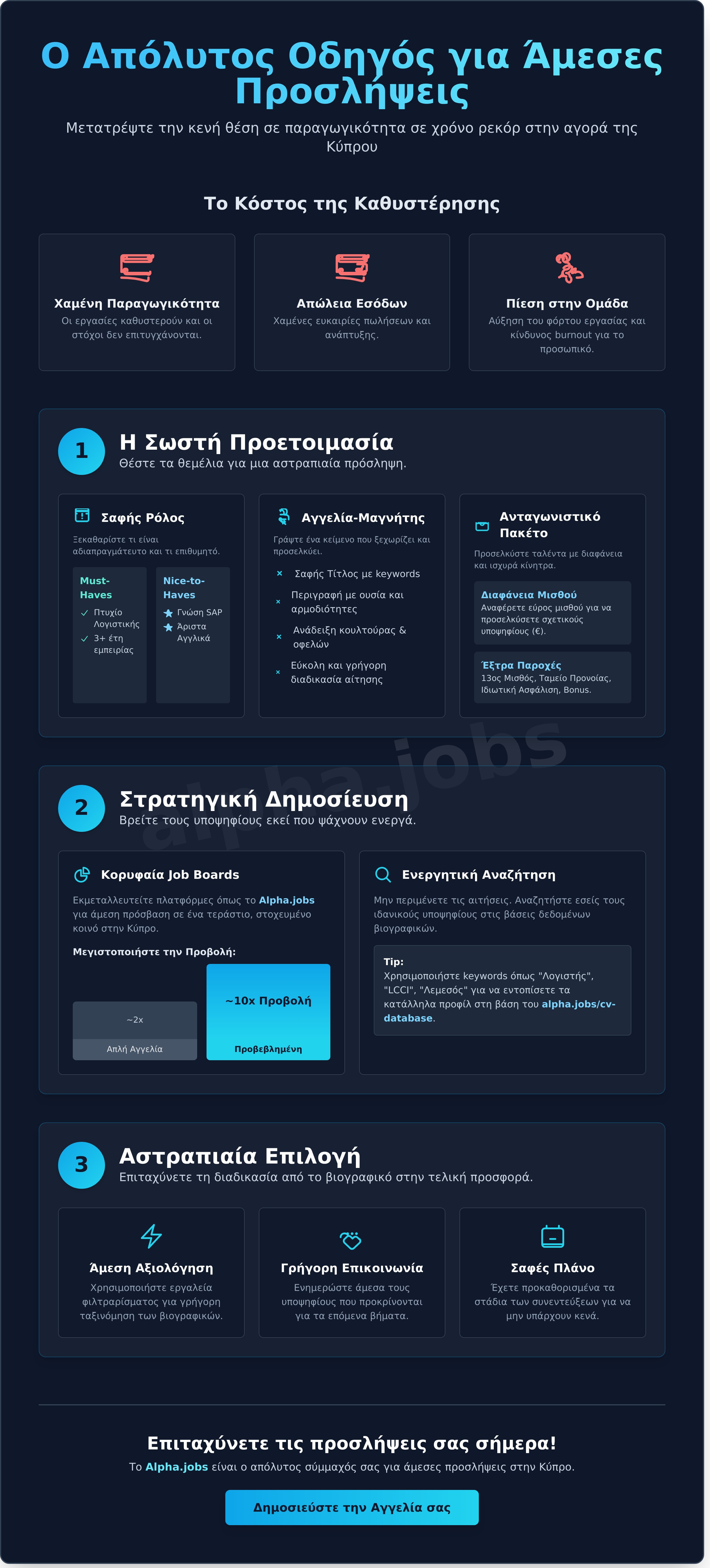 - Αξιοποιήστε τα κατάλληλα εργαλεία, όπως το Alpha.jobs, που είναι σχεδιασμένα για την αγορά της Κύπρου, για να αυτοματοποιήσετε και να επιταχύνετε ολόκληρη τη διαδικασία.