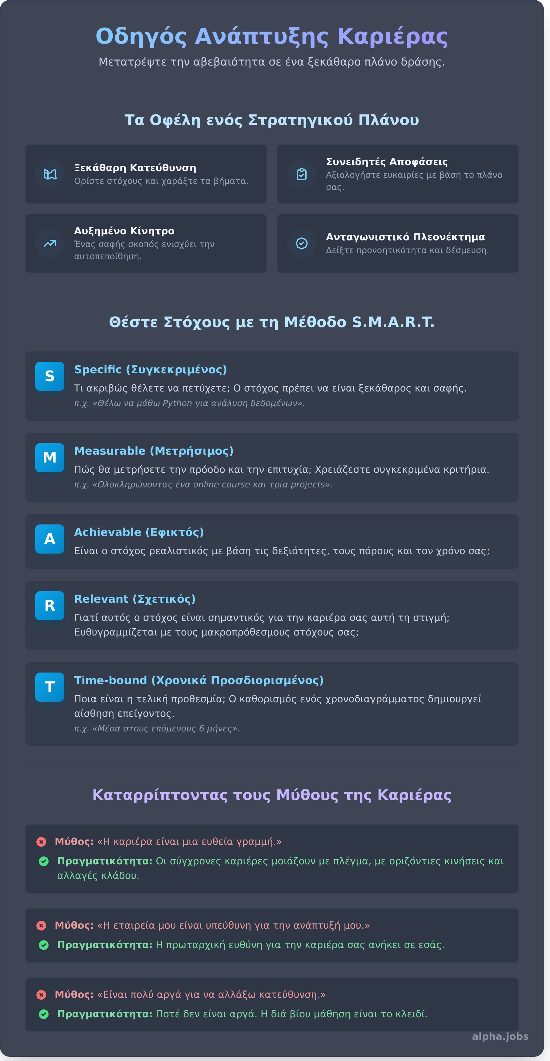 Αφού αποκτήσετε μια σαφή εικόνα του εαυτού σας, το επόμενο βήμα για την ανάπτυξη της καριέρας σας είναι να μετατρέψετε τις φιλοδοξίες σας σε συγκεκριμένους στόχους. Η μέθοδος SMART είναι ένα παγκοσμίως αναγνωρισμένο εργαλείο που εξασφαλίζει ότι οι στόχοι σας είναι ξεκάθαροι και εφικτοί. Αξιόπιστα πλαίσια, όπως ο συγκεκριμένος Οδηγός Σχεδιασμού Καριέρας του ΜΙΤ, τονίζουν τη σημασία της δομημένης στοχοθέτησης. Κάθε στόχος πρέπει να είναι:
