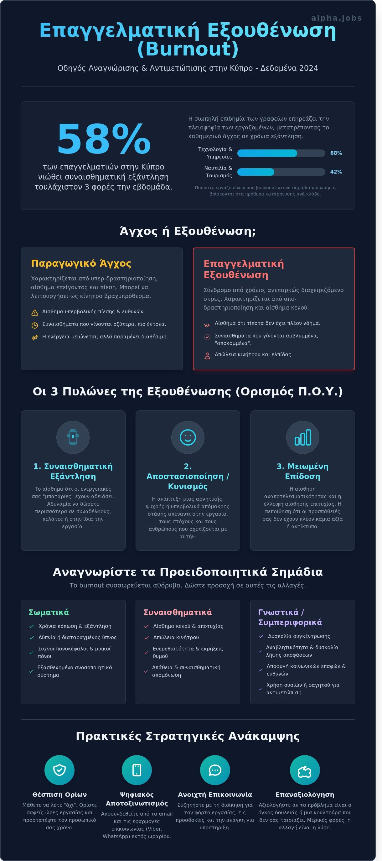 Η αναγνώριση ότι τα επαγγελματικη εξουθενωση (burnout) συμπτωματα επιμένουν παρά τις προσπάθειες για οριοθέτηση αποτελεί το πιο κρίσιμο σήμα για αλλαγή. Αν το σώμα σας αντιδρά με έντονο άγχος κάθε Κυριακή βράδυ ή αν η κούραση δεν υποχωρεί ούτε μετά από μια εβδομάδα άδειας, η λύση δεν βρίσκεται πλέον στην εσωτερική διαχείριση αλλά στην έξοδο από το τοξικό περιβάλλον. Στην κυπριακή αγορά εργασίας, το 42% των εργαζομένων δηλώνει ότι το εργασιακό στρες επηρεάζει την ψυχική τους υγεία, καθιστώντας την αναζήτηση νέας στέγης μια πράξη αυτοσυντήρησης και όχι αποτυχίας.