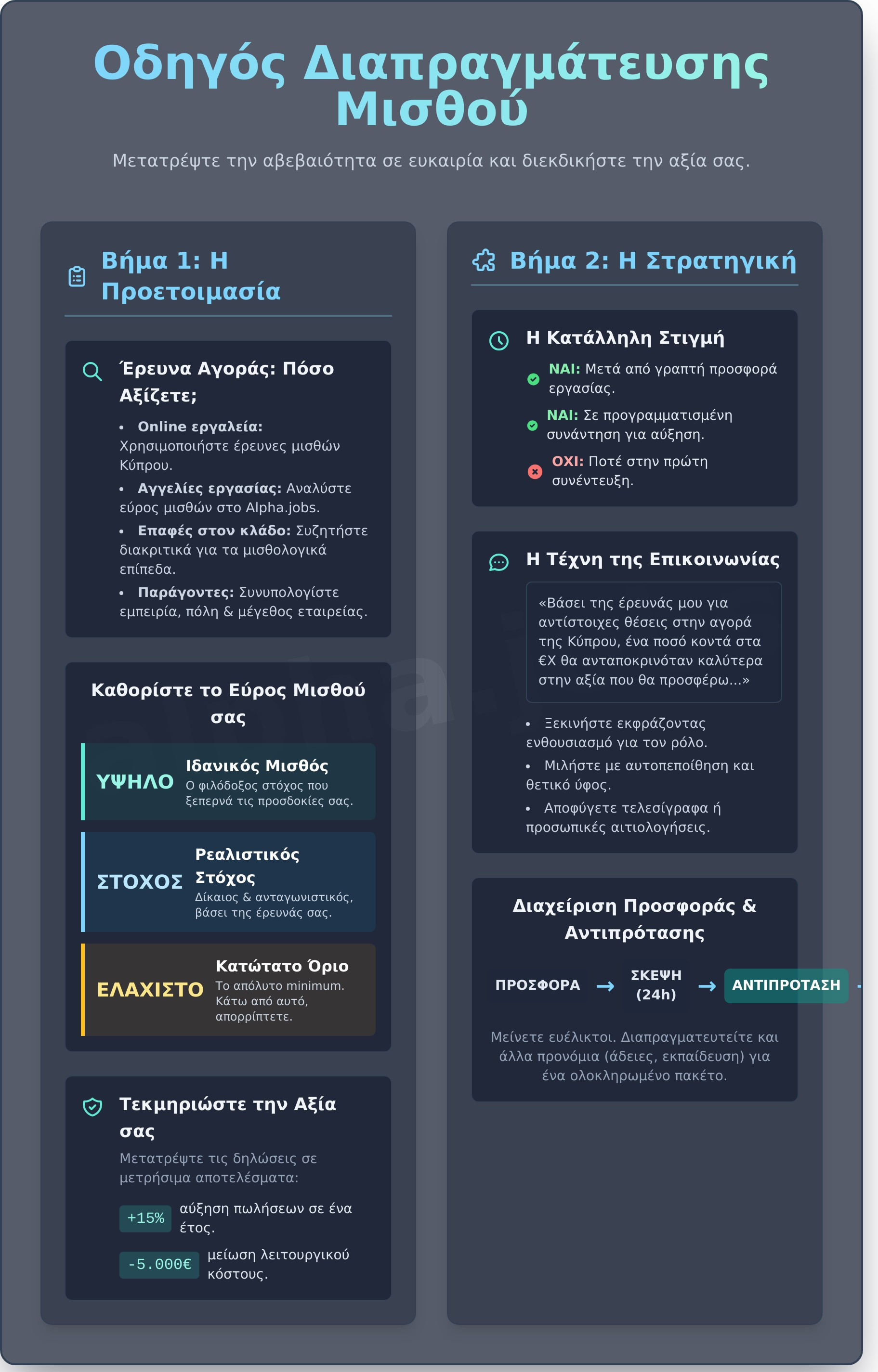 Σε αυτόν τον απόλυτο οδηγό, θα σας καθοδηγήσουμε βήμα προς βήμα για να κατακτήσετε αυτή τη σημαντική δεξιότητα. Θα μάθετε πώς να κάνετε την έρευνά σας για την κυπριακή αγορά, πώς να παρουσιάσετε τα επιτεύγματά σας με αυτοπεποίθηση και ποιες στρατηγικές να χρησιμοποιήσετε για να εξασφαλίσετε όχι μόνο υψηλότερες αποδοχές, αλλά ένα συνολικό πακέτο που αντανακλά τις ικανότητές σας. Ετοιμαστείτε να διεκδικήσετε με σιγουριά τον μισθό που πραγματικά αξίζετε και να ξεκινήσετε τη νέα σας καριέρα με την ισχυρότερη δυνατή οικονομική βάση.