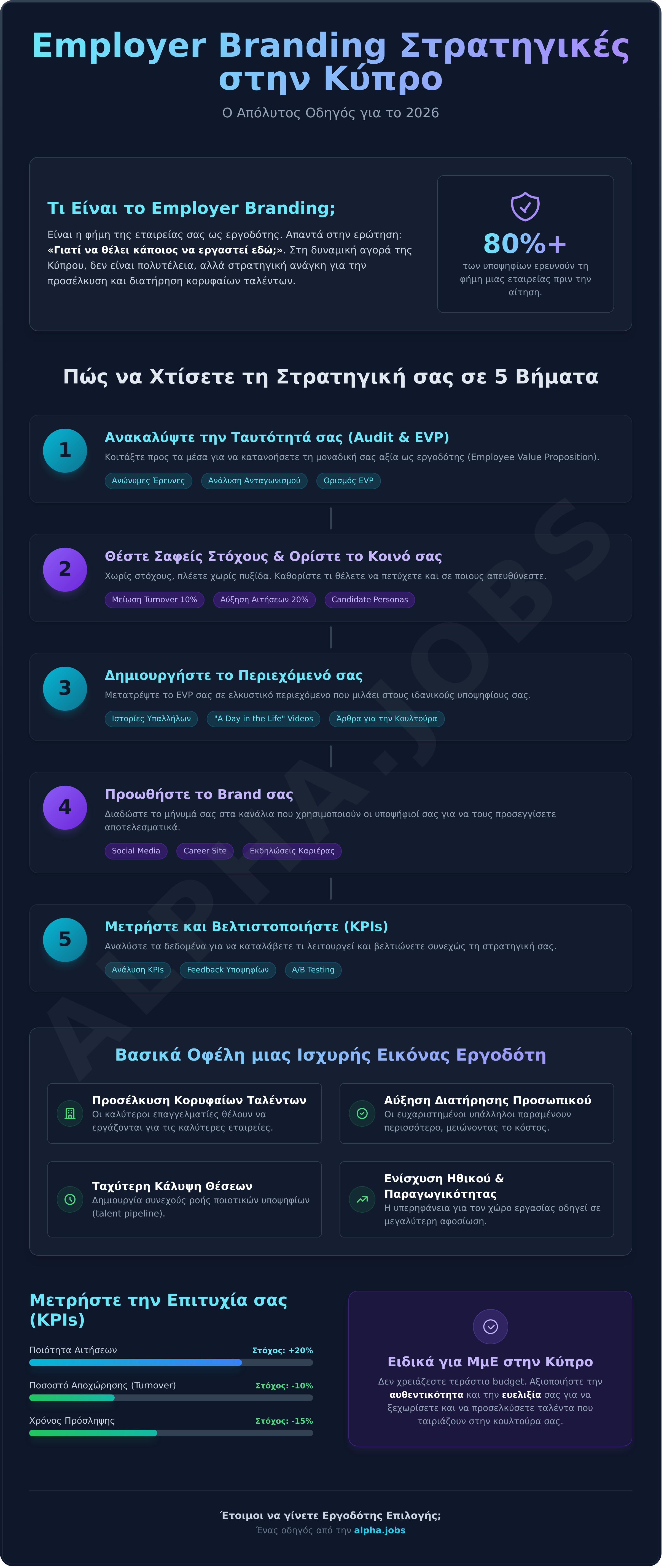 - Ο οδηγός αυτός παρέχει ένα πλήρες πλαίσιο για τις δικές σας employer branding στρατηγικές Κύπρος, καλύπτοντας τα πάντα, από τον αρχικό εσωτερικό έλεγχο μέχρι τη μέτρηση των αποτελεσμάτων.