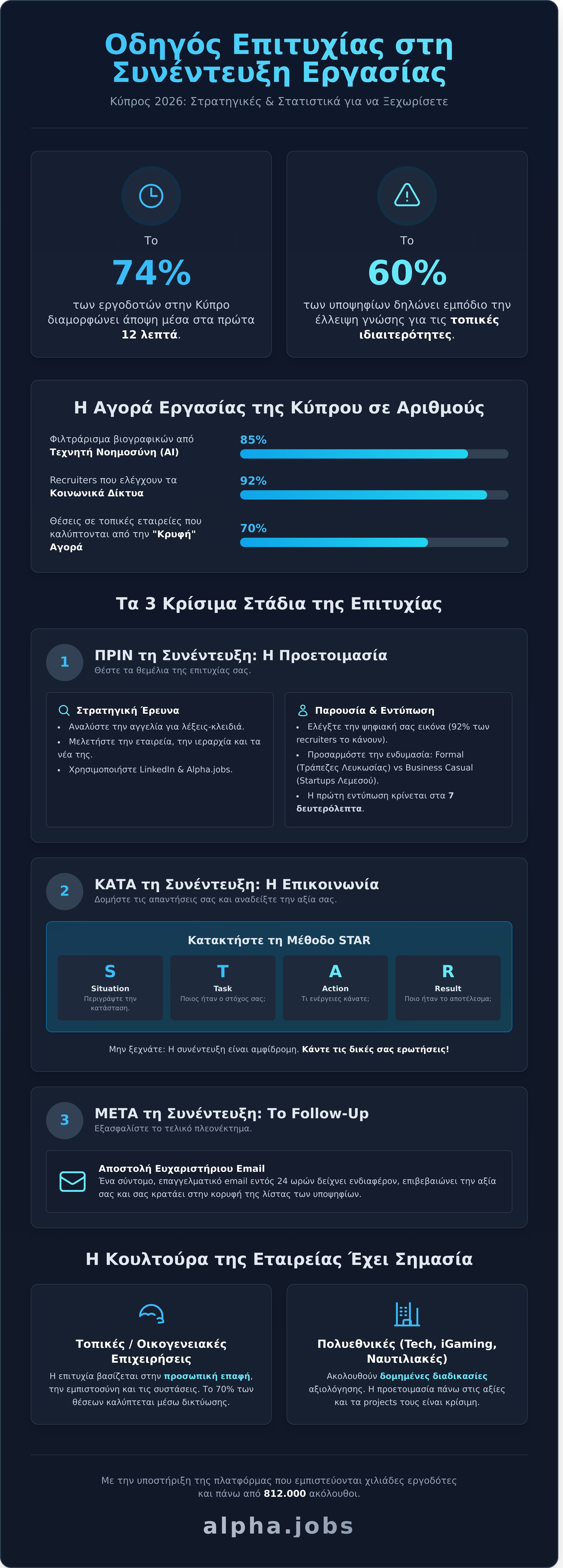 Γνωρίζατε ότι το 74% των Κυπρίων εργοδοτών το 2026 διαμορφώνει οριστική άποψη για έναν υποψήφιο μέσα στα πρώτα 12 λεπτά της συζήτησης; Στην Alpha.jobs βλέπουμε καθημερινά χιλιάδες αιτήσεις και ξέρουμε πως η αναζήτηση για τις σωστές συμβουλεσ για επιτυχημενη συνεντευξη ξεκινά από την κατανόηση αυτής της γρήγορης δυναμικής. Είναι λογικό να αισθάνεστε άγχος για την απόδοσή σας ή να δυσκολεύεστε να απαντήσετε σε "παγίδες" που κρύβουν οι recruiters στη Λευκωσία και τη Λεμεσό. Δεν είστε μόνοι σε αυτό, αφού το 60% των υποψηφίων στην Κύπρο δηλώνει ότι η έλλειψη γνώσης για τις τοπικές ιδιαιτερότητες είναι το μεγαλύτερο εμπόδιο τους.