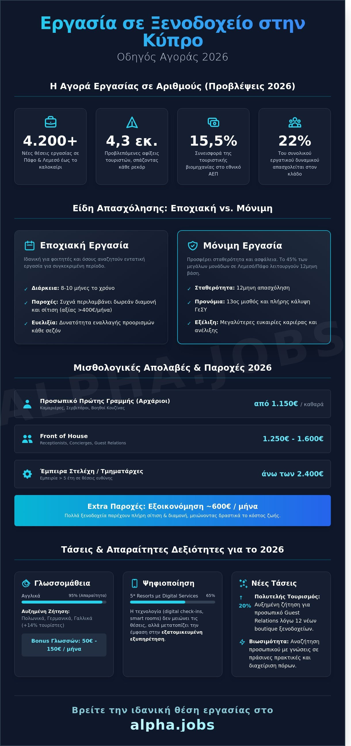 Διαχωρίζοντας τις διαθέσιμες θέσεις, παρατηρούμε ότι η εποχιακή απασχόληση (season) παραμένει η πιο δημοφιλής για φοιτητές και άτομα που επιζητούν έντονη εργασία για 8 μήνες. Ωστόσο, το 45% των μεγάλων μονάδων στη Λεμεσό και την Πάφο λειτουργούν πλέον σε 12μηνη βάση. Οι μόνιμες θέσεις προσφέρουν μεγαλύτερη ασφάλεια, 13ο μισθό και πλήρη κάλυψη από το Γενικό Σύστημα Υγείας (ΓεΣΥ), ενώ οι εποχιακοί υπάλληλοι επωφελούνται από ανταγωνιστικά πακέτα που περιλαμβάνουν συχνά δωρεάν διαμονή και σίτιση, αξίας άνω των 400€ μηνιαίως.