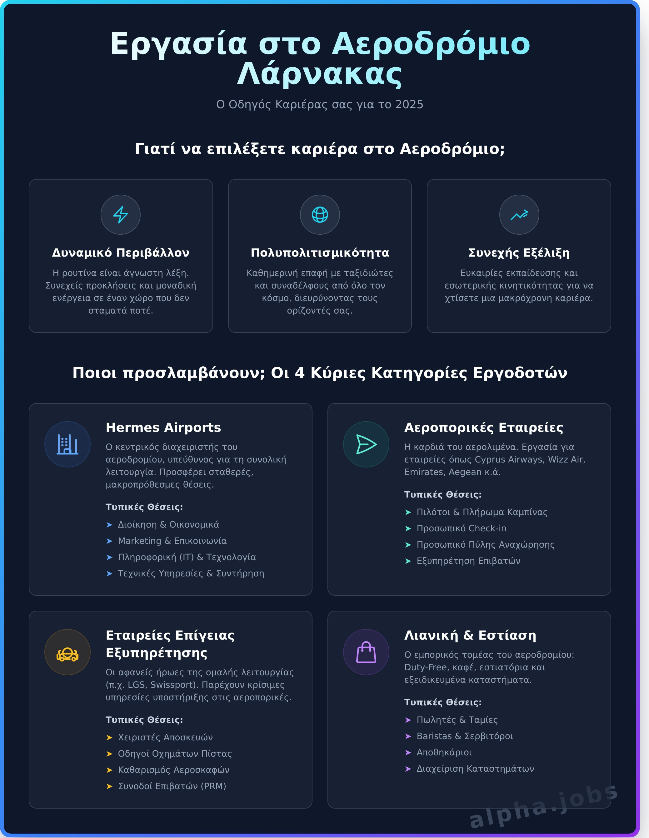 Εδώ, θα βρείτε συγκεντρωμένες όλες τις πληροφορίες που χρειάζεστε. Θα χαρτογραφήσουμε για εσάς κάθε πιθανό εργοδότη —από τις αεροπορικές εταιρείες και τις υπηρεσίες επίγειας εξυπηρέτησης μέχρι τα καταστήματα λιανικής και τους χώρους εστίασης— και θα αναλύσουμε τα είδη των διαθέσιμων θέσεων. Στόχος μας είναι να σας καθοδηγήσουμε βήμα-βήμα, ώστε να προετοιμαστείτε κατάλληλα και να εξασφαλίσετε τη θέση που ονειρεύεστε. Η καριέρα σας είναι έτοιμη για απογείωση. Ας ξεκινήσουμε!