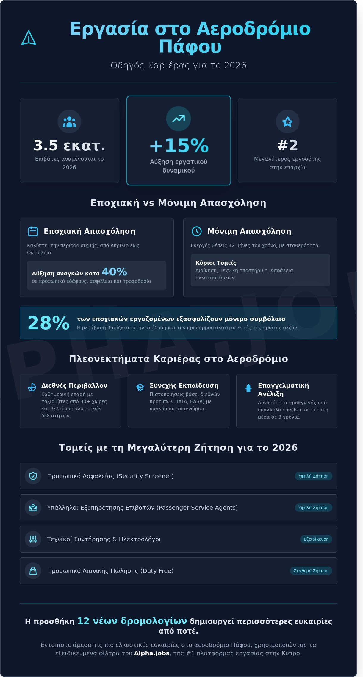 Με την προσθήκη 12 νέων δρομολογίων που έχουν ήδη ανακοινωθεί για το ερχόμενο έτος, οι ευκαιρίες απασχόλησης θα είναι περισσότερες από κάθε άλλη φορά. Το αεροδρόμιο Πάφου δεν είναι απλώς ένας σταθμός μεταφοράς, αλλά ένας ζωντανός οργανισμός που προσφέρει πραγματικές προοπτικές καριέρας για όσους αναζητούν ένα σοβαρό και δυναμικό ξεκίνημα στην επαγγελματική τους ζωή.