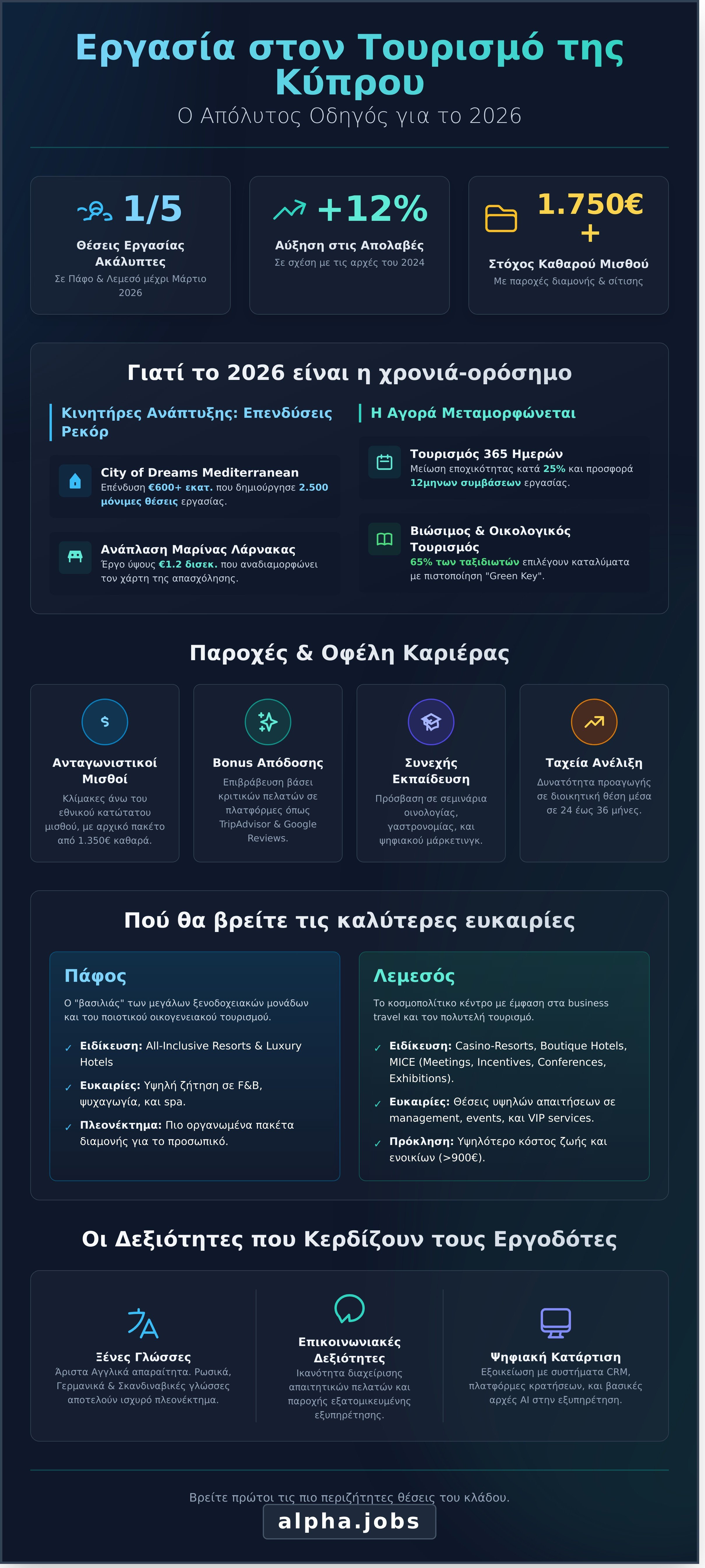 Γνωρίζατε ότι μέχρι τον Μάρτιο του 2026, 1 στις 5 θέσεις εργασίας σε μεγάλα ξενοδοχειακά συγκροτήματα της Πάφου και της Λεμεσού παραμένει ακάλυπτη, παρά τις αυξήσεις της τάξης του 12% στα πακέτα απολαβών; Είναι αλήθεια πως η εργασια στον τουριστικο τομεα κυπροσ φαντάζει συχνά ως μια δύσκολη εξίσωση, καθώς η πίεση του διεθνούς ανταγωνισμού και τα ενοίκια που ξεπερνούν τα 900€ στις παραλιακές ζώνες προκαλούν δικαιολογημένο άγχος σε κάθε νέο υποψήφιο. Κατανοούμε απόλυτα την αβεβαιότητα που νιώθετε για τις πραγματικές συνθήκες εργασίας και την επιθυμία σας για έναν αξιόπιστο εργοδότη που προσφέρει σταθερότητα και σεβασμό.