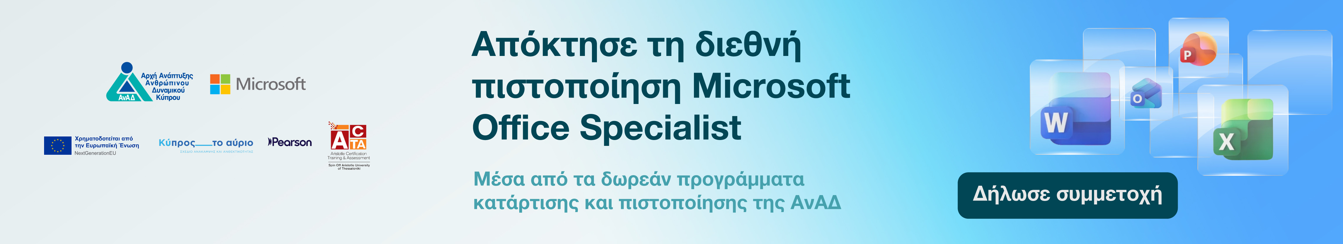 Σε μια εποχή όπου η ψηφιακή επάρκεια αποτελεί κριτήριο επαγγελματικής επιτυχίας, η ανάγκη για πιστοποιημένες δεξιότητες είναι πιο επιτακτική από ποτέ. Η Αρχή Ανάπτυξης Ανθρώπινου Δυναμικού Κύπρου (ΑνΑΔ), δίνει μια σημαντική ευκαιρία σε όσους θέλουν να ενισχύσουν τις ψηφιακές τους δεξιότητες, προσφέροντας δωρεάν προγράμματα κατάρτισης και συμμετοχή σε εξετάσεις για την απόκτηση της διεθνώς αναγνωρισμένης πιστοποίησης Microsoft Office Specialist (MOS).