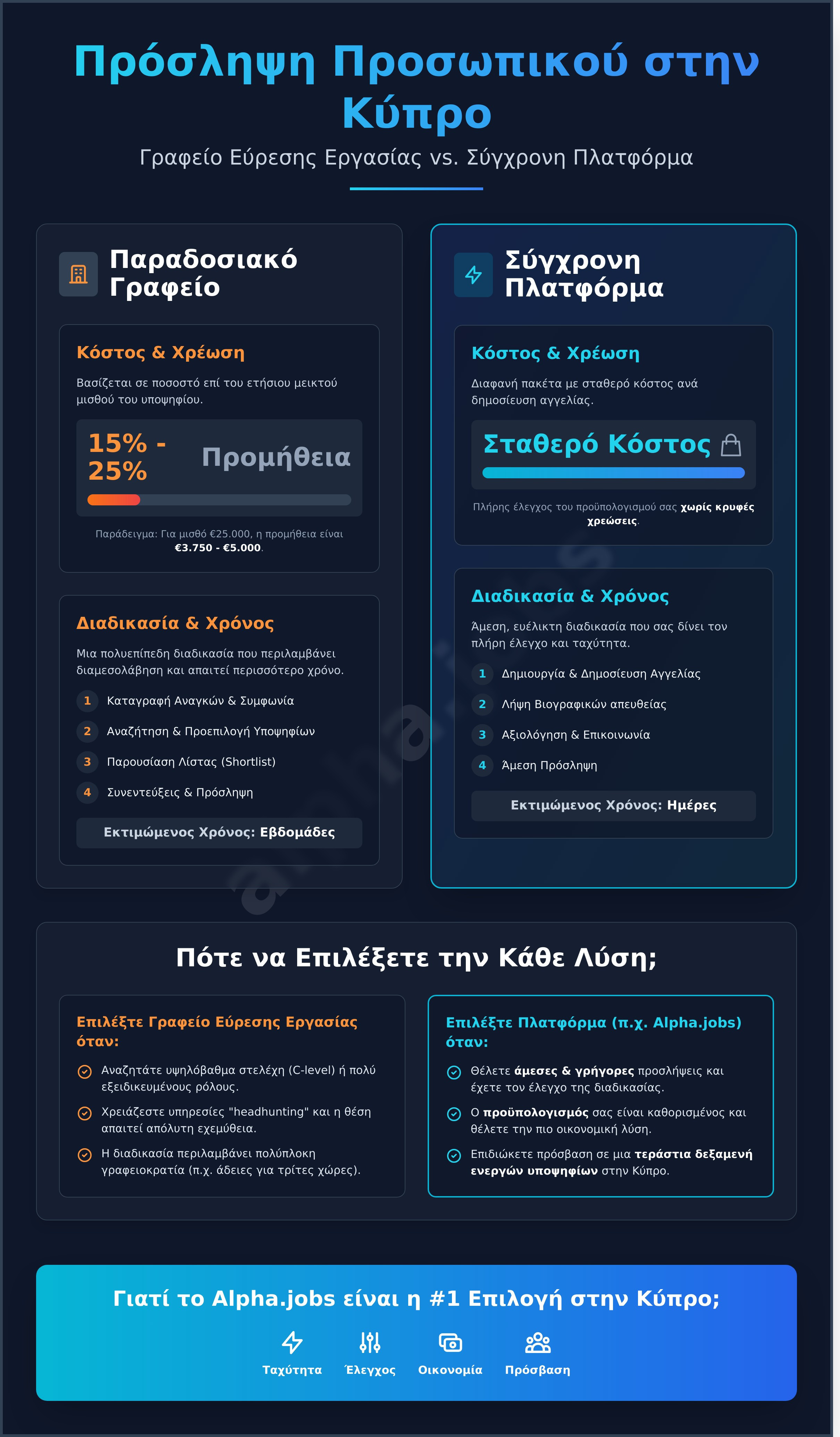 Η κατανόηση των διαφορών στο κόστος και τη διαδικασία είναι κρίσιμη. Όταν αναλύετε για ένα γραφείο ευρέσεως εργασίας στην Κύπρο τις τιμές και τις υπηρεσίες του, είναι χρήσιμο να τις συγκρίνετε με τη σύγχρονη εναλλακτική.