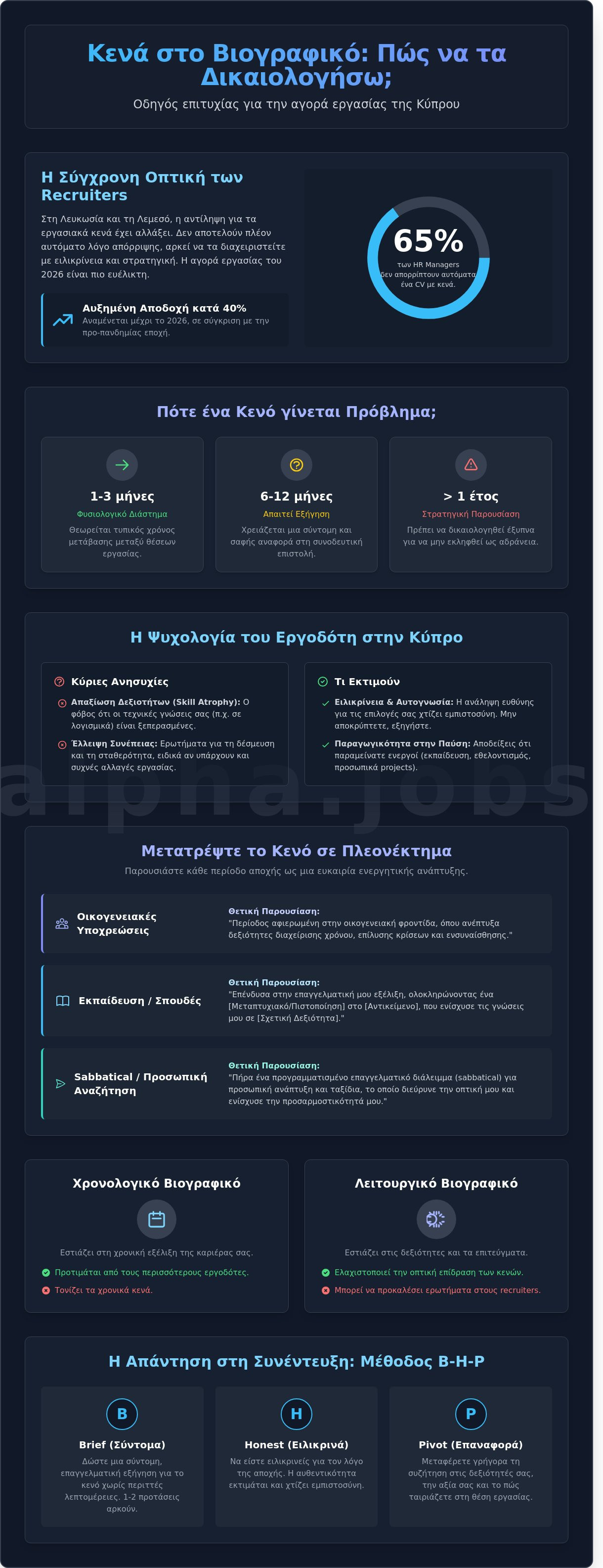 - Μάθετε τη μέθοδο "Brief, Honest, Pivot" για να απαντήσετε στην κρίσιμη ερώτηση "κενά στο βιογραφικό πωσ τα δικαιολογω" μετατρέποντας την παθητική αναμονή σε ενεργητική ανάπτυξη.