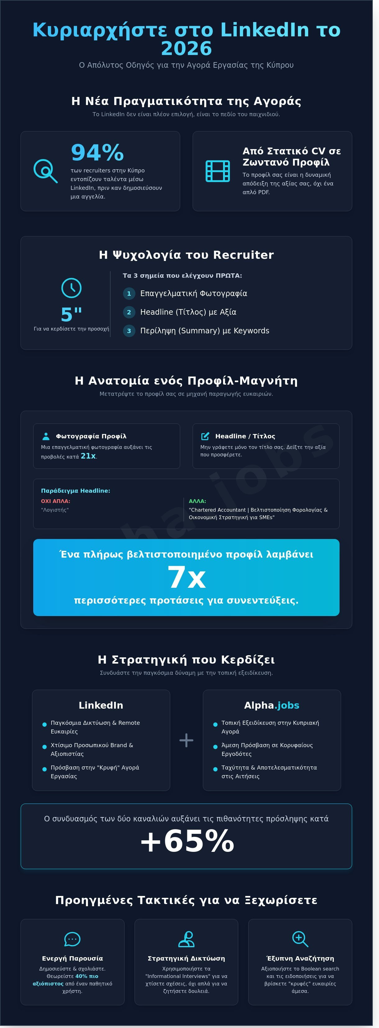 - Δείτε πώς να συνδυάσετε τη δύναμη του LinkedIn με τη βάση βιογραφικών του Alpha.jobs για να μεγιστοποιήσετε την προβολή σας στους κορυφαίους recruiters του νησιού.