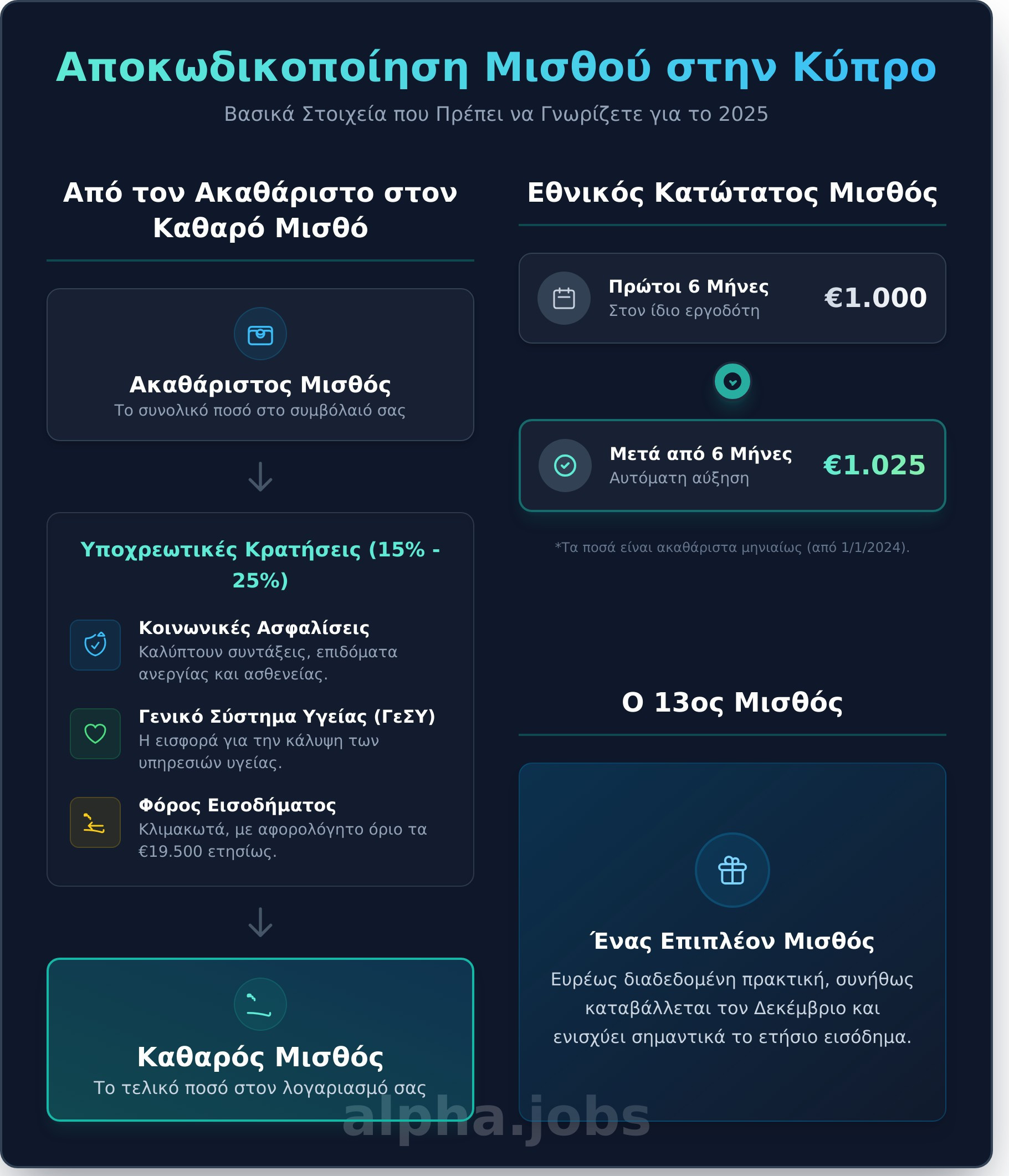 Από την 1η Ιανουαρίου 2024, ο εθνικός κατώτατος μισθός στην Κύπρο ορίζεται στα €1.000 ακαθάριστα για τους πρώτους έξι μήνες απασχόλησης σε έναν εργοδότη. Μετά τη συμπλήρωση έξι μηνών, ο μισθός αυξάνεται αυτόματα στα €1.025 ακαθάριστα. Αυτό το μέτρο αφορά την πλειοψηφία των εργαζομένων πλήρους απασχόλησης και λειτουργεί ως βάση για τη διαμόρφωση της συνολικής μισθολογικής κλίμακας, επηρεάζοντας τις διαπραγματεύσεις ακόμη και για υψηλότερες θέσεις.