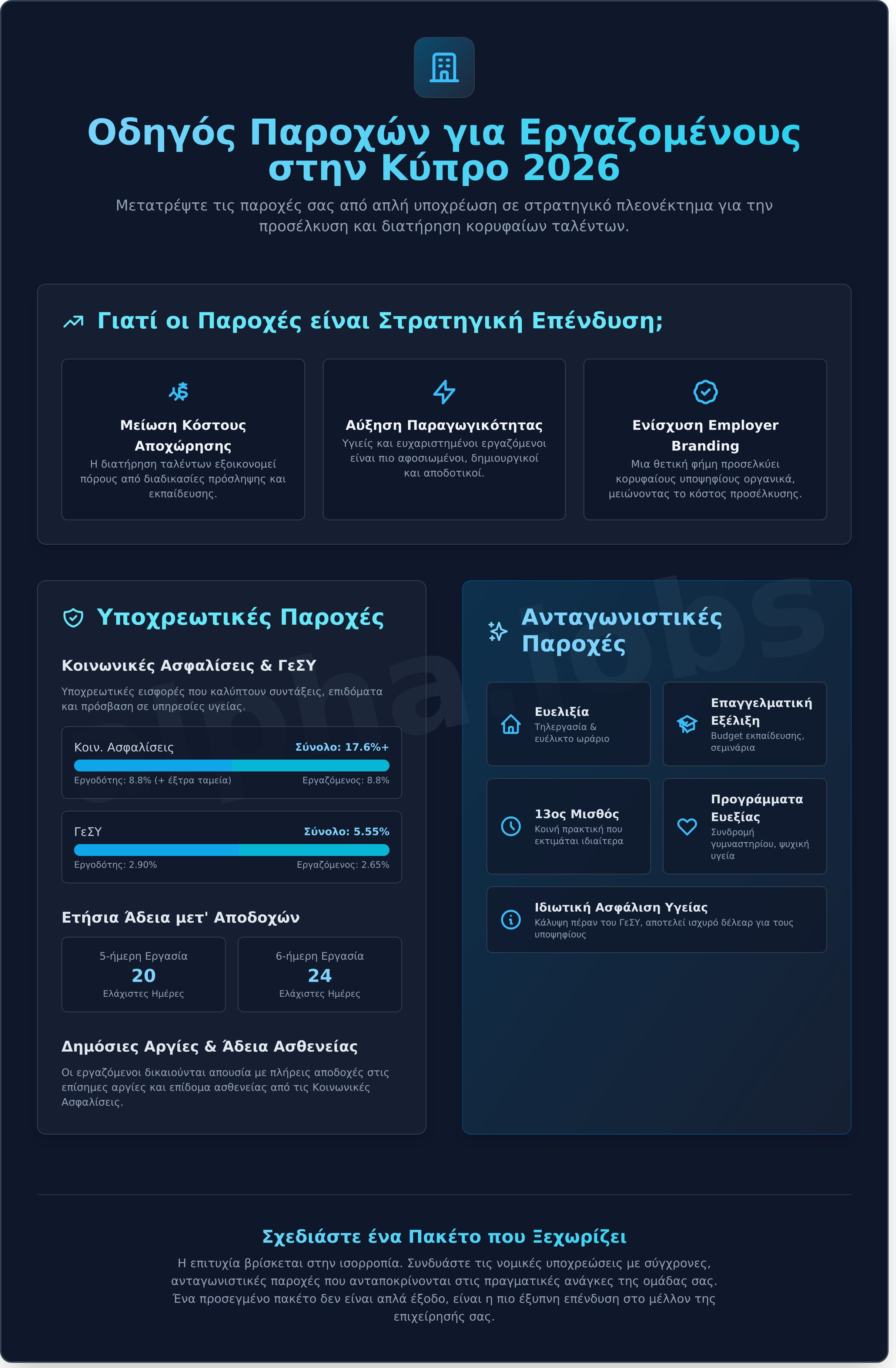 - Ανακαλύψτε ποιες ανταγωνιστικές παροχές σε εργαζομένους Κύπρος περιμένουν πλέον οι υποψήφιοι, και γιατί η στρατηγική σας για τις παροχές σε εργαζομένους Κύπρος πρέπει να περιλαμβάνει από ιδιωτική ασφάλιση υγείας μέχρι ευελιξία.
