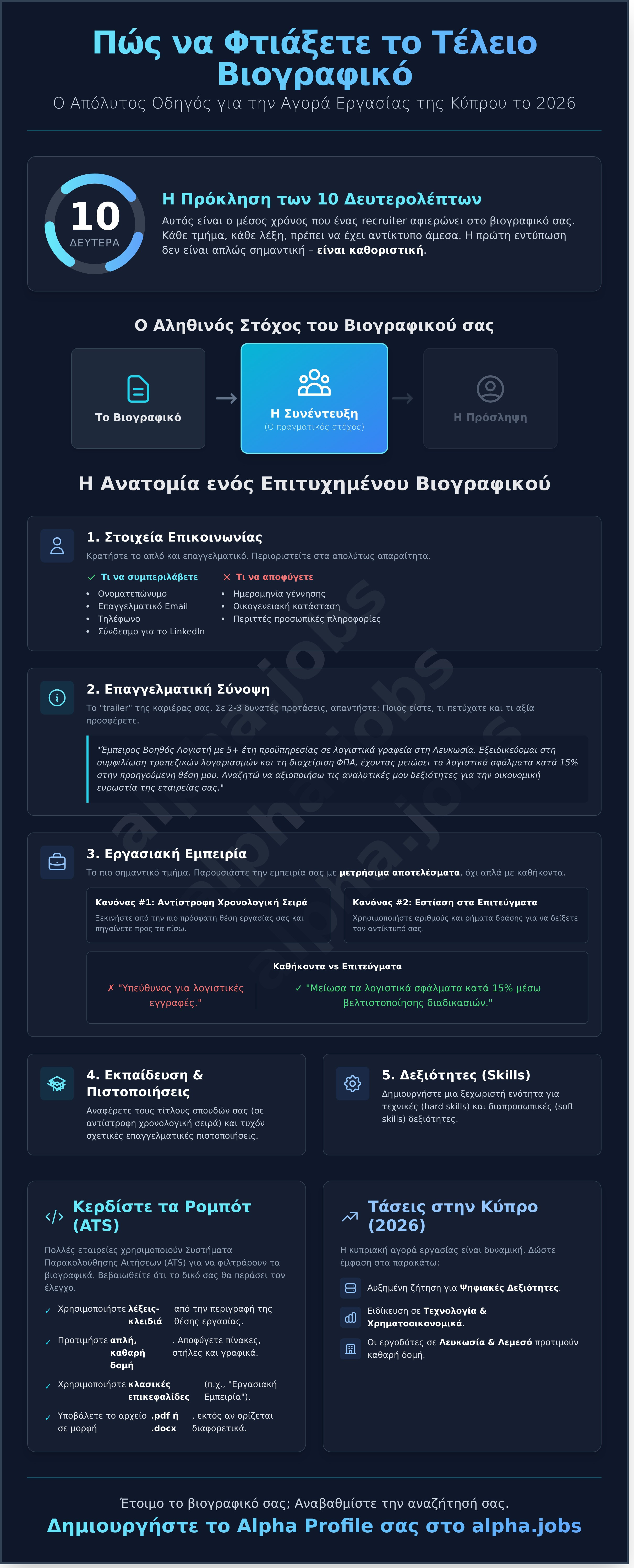 - Πέρα από το να μάθετε απλώς πώς να φτιάξω βιογραφικό, δείτε πώς ένα δυναμικό Alpha Profile μπορεί να αυξήσει την προβολή σας σε κορυφαίους εργοδότες, μετατρέποντας το CV σας σε ένα ενεργό εργαλείο αναζήτησης εργασίας.