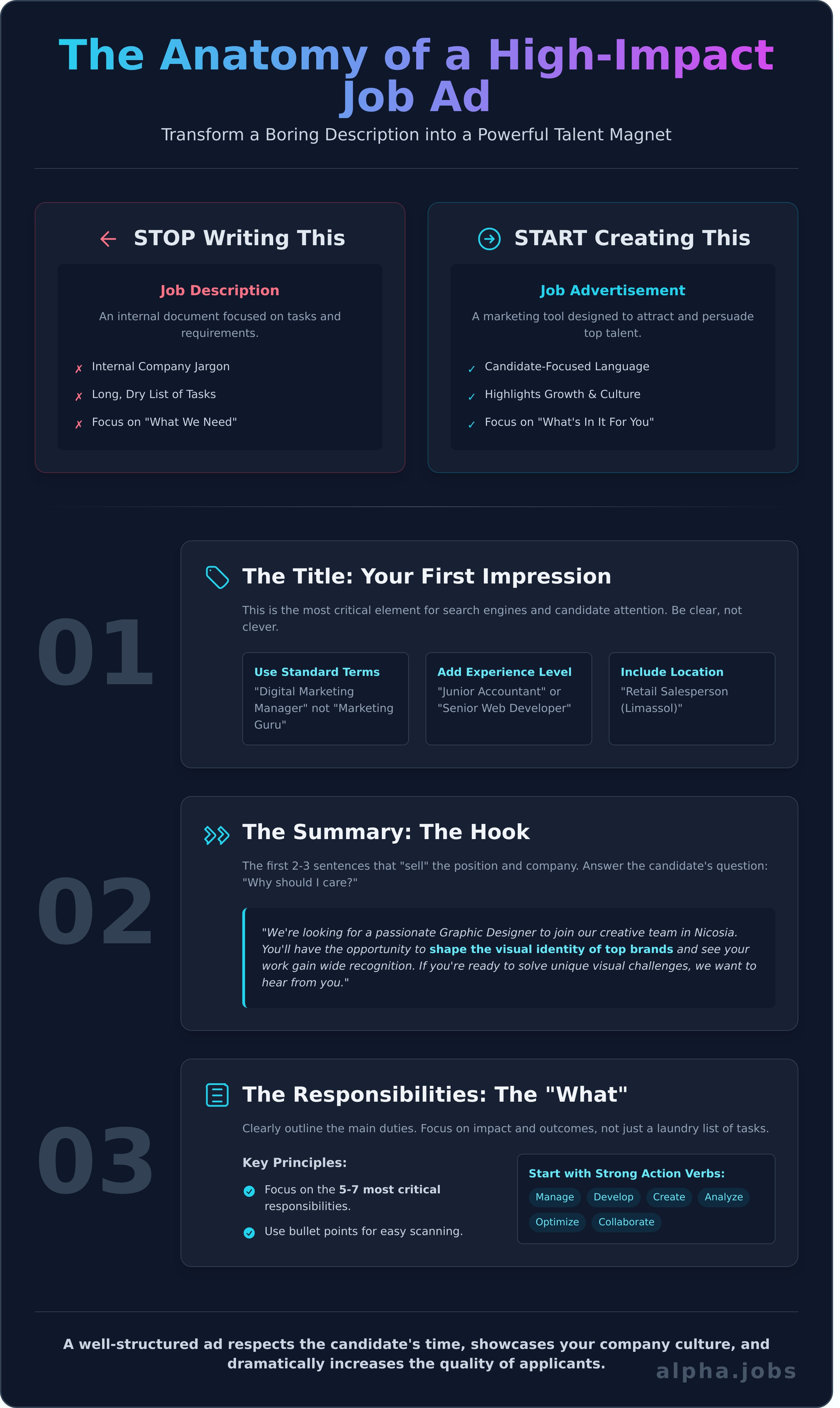 - Το πρώτο βήμα στο πώς να γράψω μια αποτελεσματική αγγελία εργασίας είναι να την αντιμετωπίζετε ως διαφήμιση, όχι ως απλή περιγραφή θέσης, για να προσελκύσετε τους κορυφαίους υποψηφίους στην Κύπρο.