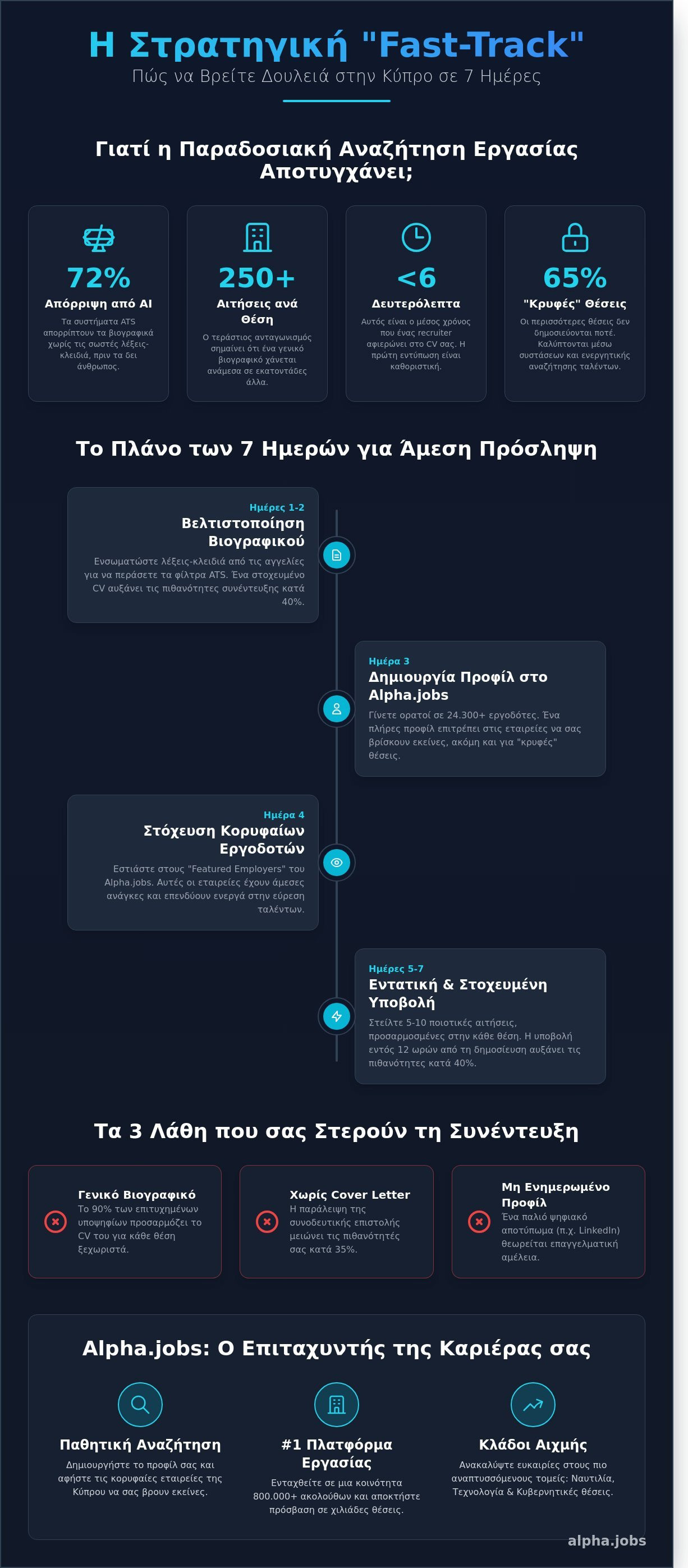 - Υιοθετήστε το πλάνο "Fast-Track" 7 ημερών για να μεταμορφώσετε την αναζήτησή σας από μια χρονοβόρα διαδικασία σε μια στοχευμένη στρατηγική επιτυχίας στην Κύπρο.
