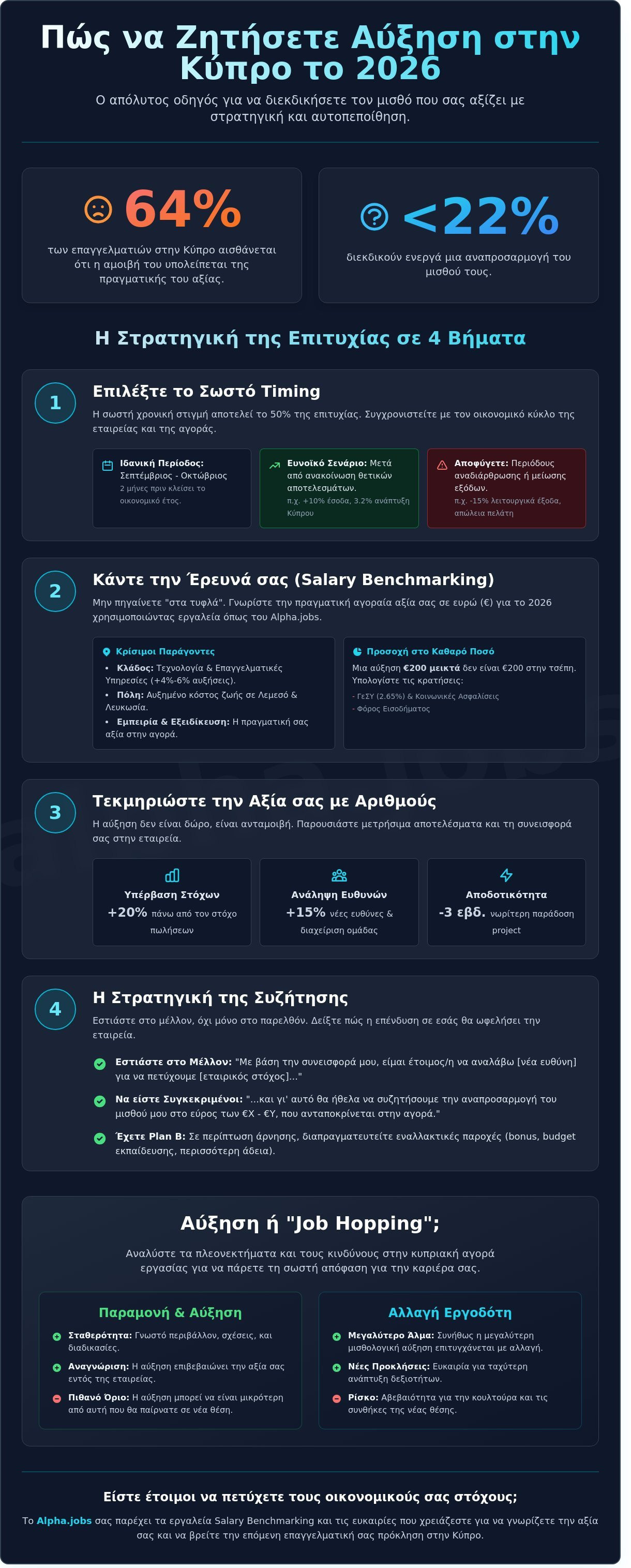 Η επιτυχία στο πωσ να ζητησω αυξηση εξαρτάται από την προετοιμασία. Μην αφήνετε την τύχη να ορίσει το μέλλον σας. Συγκεντρώστε τα δεδομένα σας, μελετήστε την αγορά της Κύπρου και επιλέξτε μια στιγμή που η συνεισφορά σας είναι πιο ορατή από ποτέ. Μια αύξηση δεν είναι δώρο, είναι η δίκαιη ανταμοιβή για την αξία που δημιουργήσατε τους τελευταίους μήνες στο γραφείο.