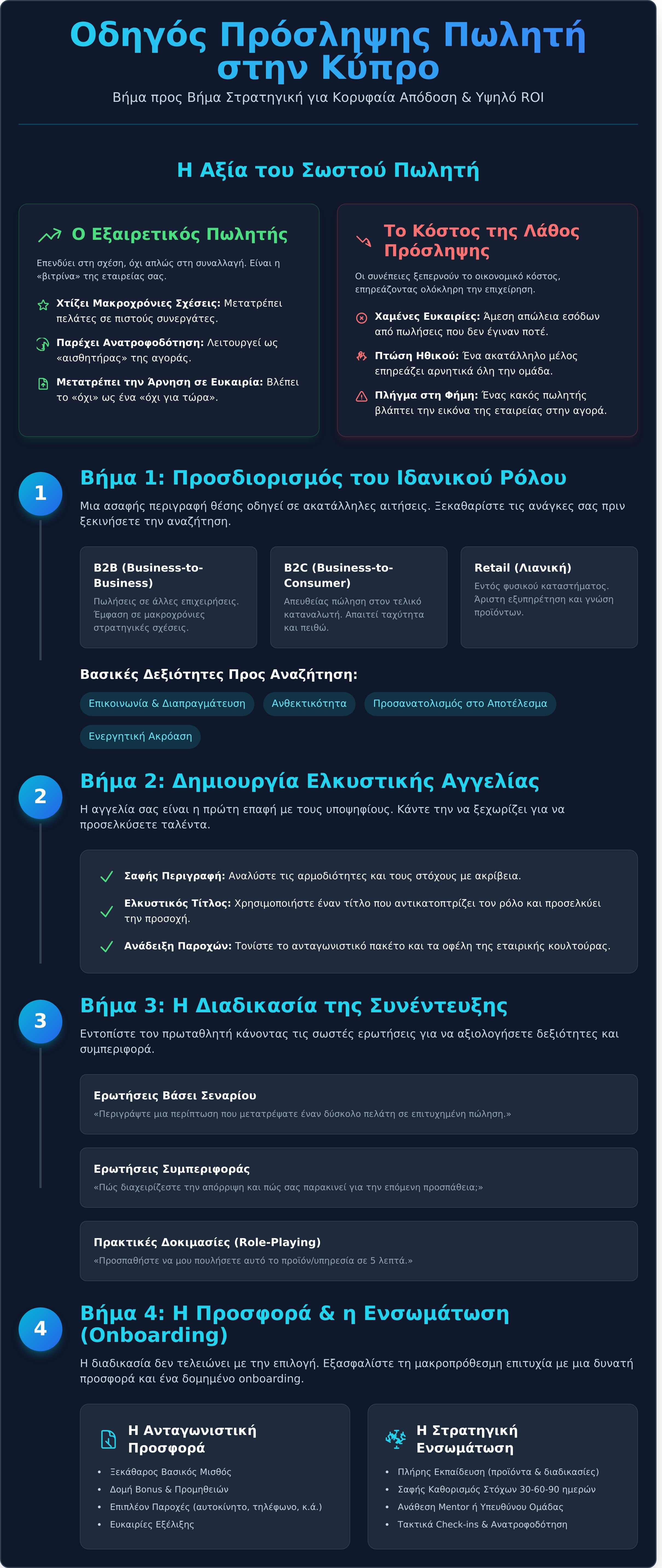 - Η διαδικασία δεν τελειώνει με την επιλογή. Μια ανταγωνιστική προσφορά και ένα καλό onboarding είναι απαραίτητα για να ολοκληρωθεί με επιτυχία η πρόσληψη πωλητή στην Κύπρο και να διασφαλιστεί η μακροπρόθεσμη παραμονή του.