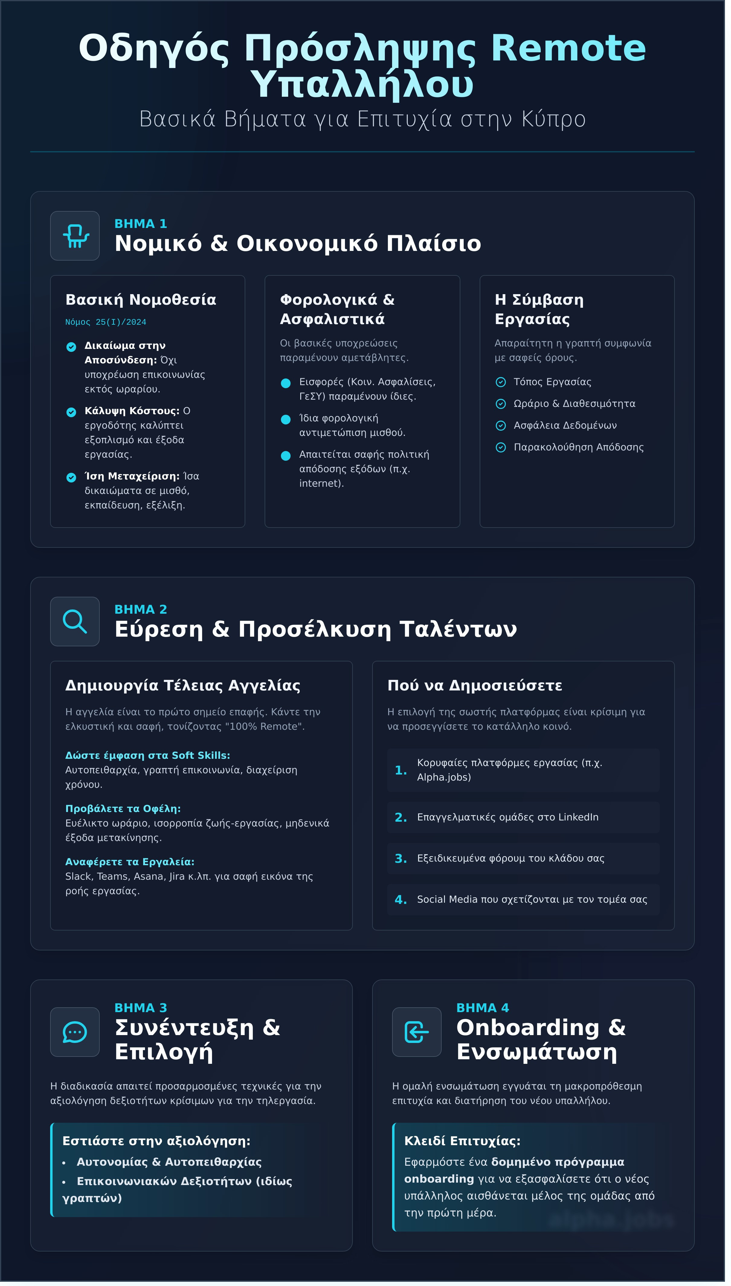 - Μάθετε πώς να δημιουργείτε αγγελίες εργασίας που προσελκύουν κορυφαία ταλέντα από όλη την Κύπρο, ένα κρίσιμο στάδιο για την πρόσληψη remote υπαλλήλου Κύπρος.