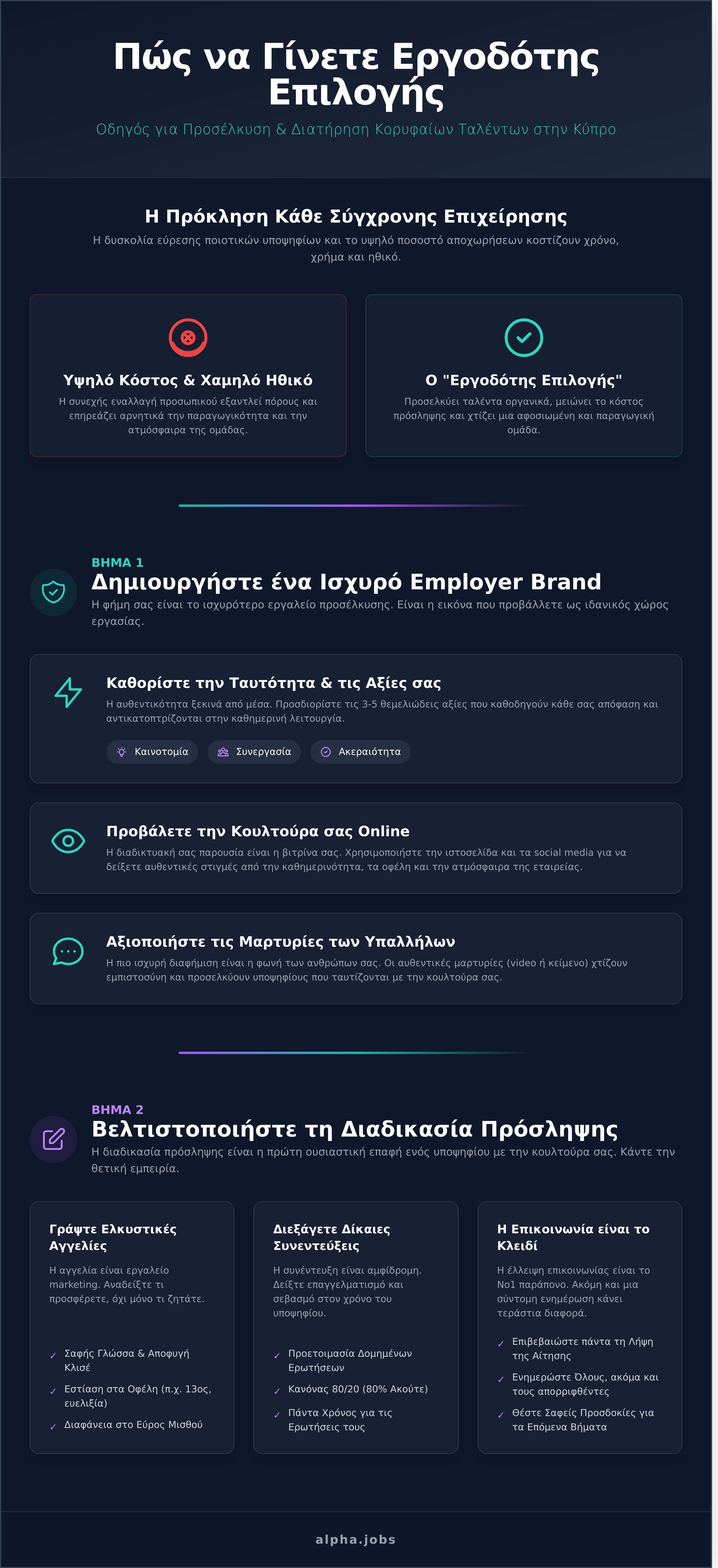 Σε αυτόν τον οδηγό, θα μοιραστούμε μαζί σας πρακτικές στρατηγικές, ειδικά προσαρμοσμένες για την κυπριακή πραγματικότητα. Θα ανακαλύψετε πώς να χτίσετε μια ακαταμάχητη φήμη, να προσελκύετε τους καλύτερους υποψηφίους χωρίς κόπο και να δημιουργήσετε ένα περιβάλλον εργασίας που εμπνέει αφοσίωση, αυξάνει την παραγωγικότητα και μειώνει δραστικά το κόστος της συνεχούς εναλλαγής προσωπικού. Ετοιμαστείτε να μεταμορφώσετε την προσέγγισή σας και να δείτε την ομάδα σας να ανθίζει.