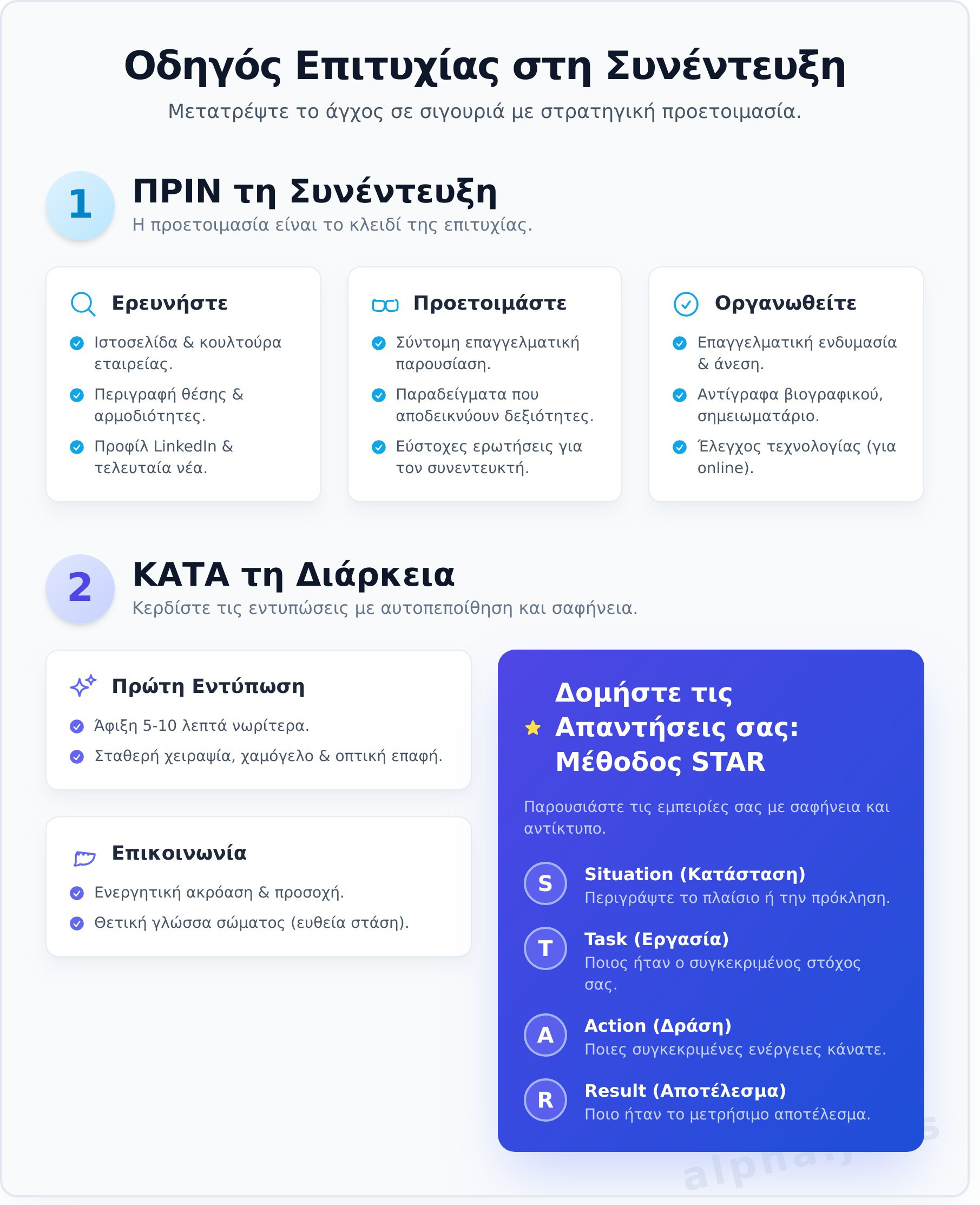 - Επιβεβαίωση στοιχείων: Διπλοτσεκάρετε τη διεύθυνση (ή το link για online συνέντευξη), την ώρα και το όνομα του συνομιλητή σας.