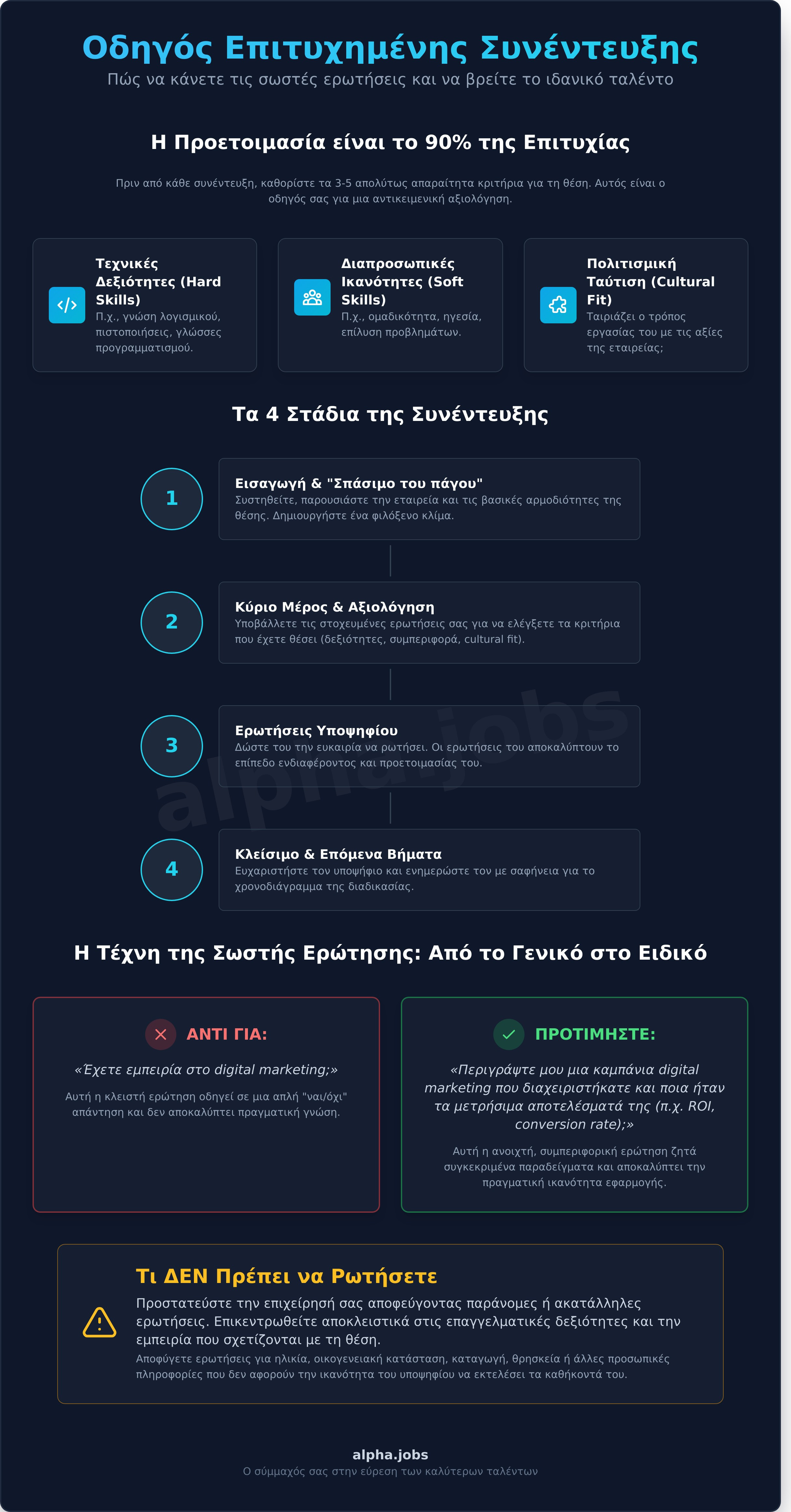 Είναι ζωτικής σημασίας να εκπαιδεύσετε όλη την ομάδα που συμμετέχει στις συνεντεύξεις, ώστε να διασφαλίσετε ότι όλοι κατανοούν και σέβονται αυτά τα όρια. Μια δίκαιη και επαγγελματική διαδικασία όχι μόνο σας προστατεύει νομικά, αλλά και ενισχύει τη φήμη της εταιρείας σας, προσελκύοντας τα καλύτερα ταλέντα που θα βρείτε στο alpha.jobs.