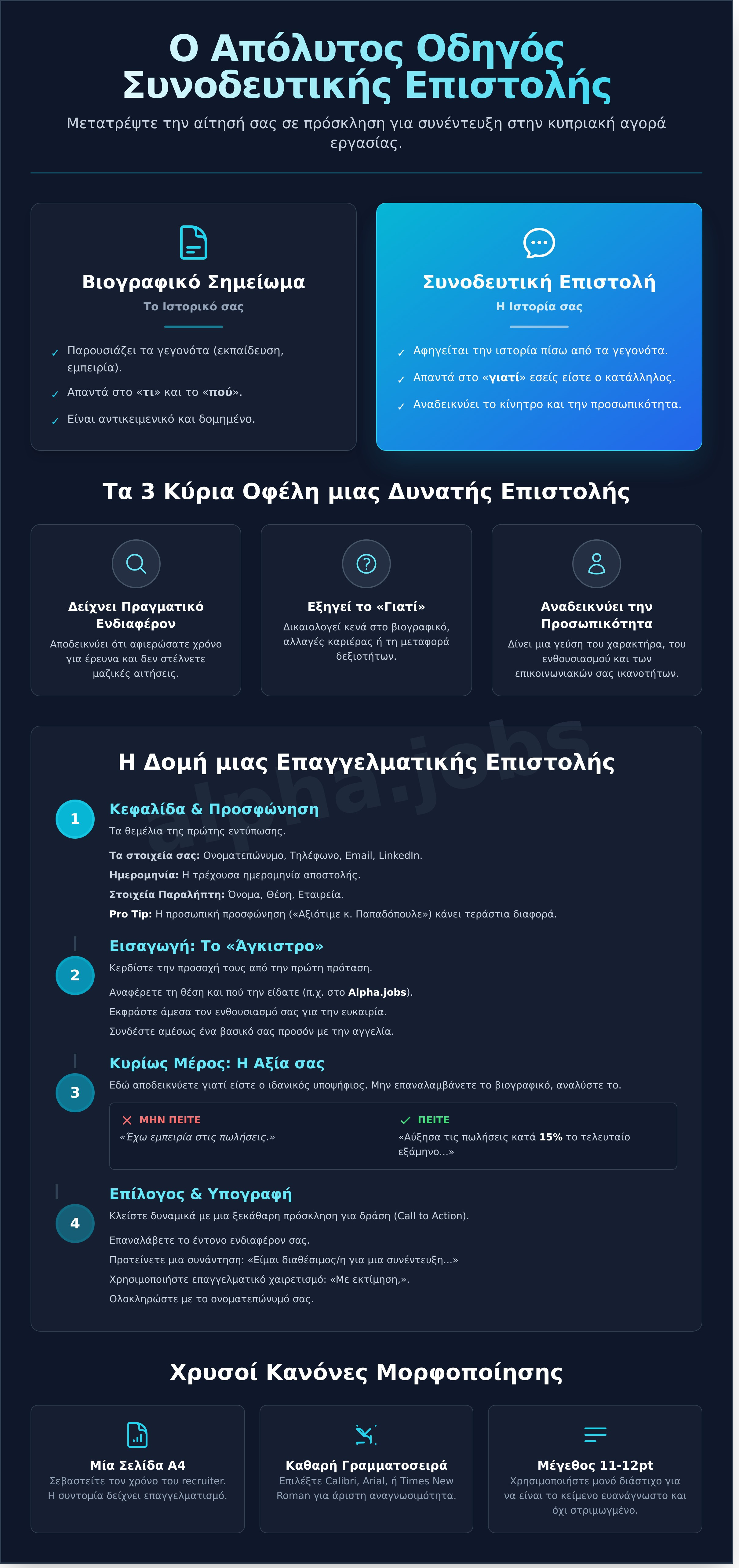 Εισαγωγή: Η πρώτη παράγραφος είναι το «άγκιστρό» σας. Αναφέρετε με σαφήνεια τη θέση για την οποία κάνετε αίτηση και πού την είδατε (π.χ., στο Alpha.jobs). Εκφράστε τον ενθουσιασμό σας για την ευκαιρία και δηλώστε αμέσως γιατί είστε ο ιδανικός υποψήφιος, συνδέοντας ένα βασικό σας προσόν με την αγγελία.