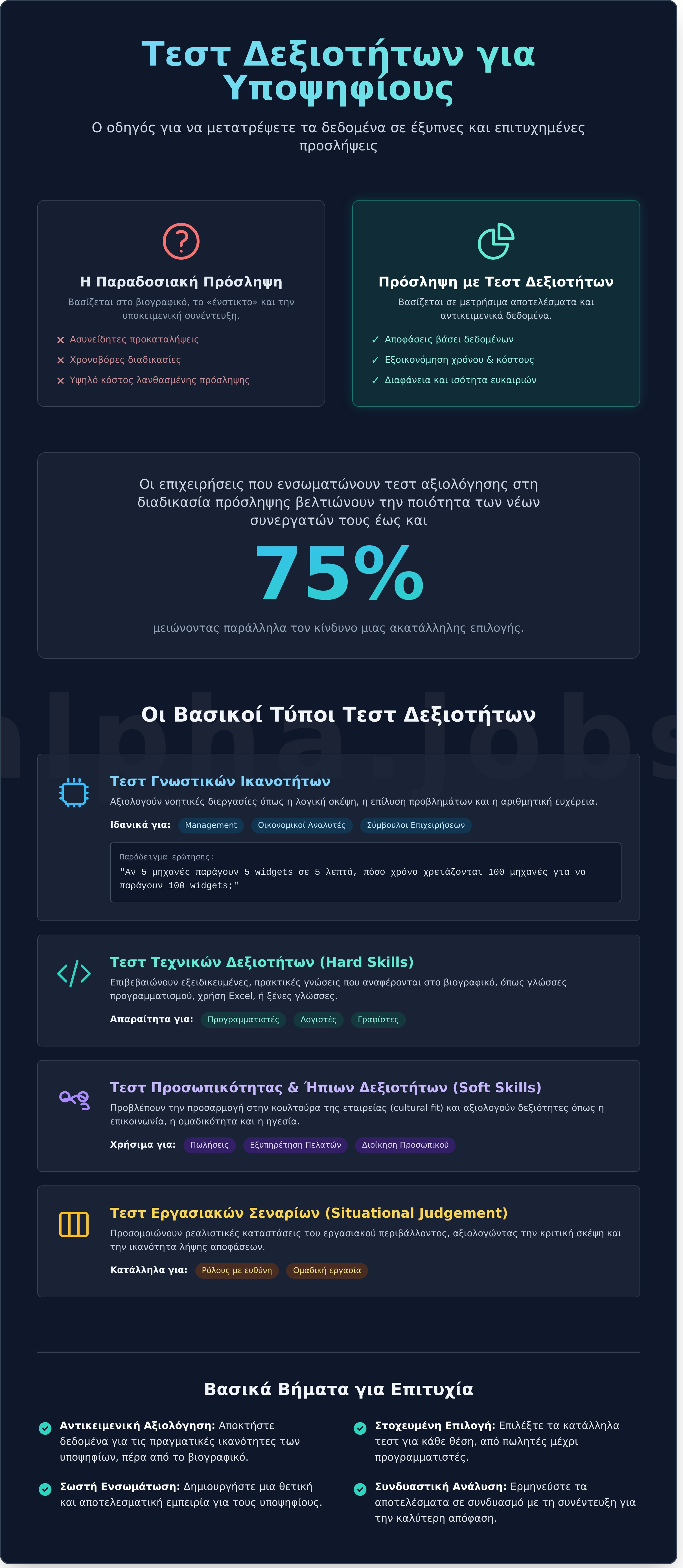 Στη σημερινή ανταγωνιστική αγορά εργασίας της Κύπρου, ένα εντυπωσιακό βιογραφικό δεν αρκεί. Πώς μπορείτε να είστε σίγουροι ότι ένας υποψήφιος διαθέτει πραγματικά τις δεξιότητες που ισχυρίζεται; Η απάντηση βρίσκεται στα τεστ δεξιοτήτων. Τα τεστ αυτά είναι αντικειμενικά, σταθμισμένα εργαλεία που αξιολογούν συγκεκριμένες ικανότητες, από την τεχνική γνώση (π.χ. προγραμματισμός, λογιστική) μέχρι τις ήπιες δεξιότητες (soft skills) όπως η κριτική σκέψη και η επικοινωνία. Για μια βαθύτερη κατανόηση του τι είναι τα τεστ δεξιοτήτων και των διαφόρων τύπων τους, μπορείτε να ανατρέξετε σε εξειδικευμένες πηγές. Σε αντίθεση με το βιογραφικό που περιγράφει το παρελθόν, τα τεστ δεξιοτητων για υποψηφιουσ αποκαλύπτουν την τρέχουσα απόδοση και τις πραγματικές δυνατότητες.