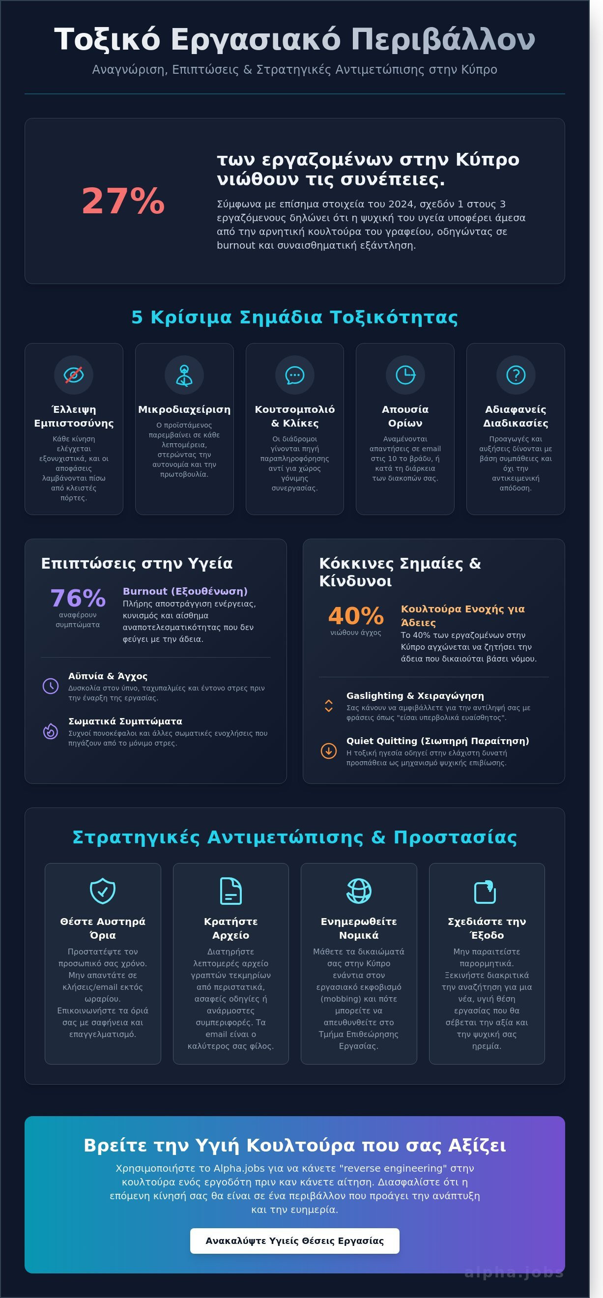 Η αποχώρηση από έναν ανθυγιεινό χώρο αποτελεί το πρώτο και πιο ουσιαστικό βήμα για την ανάκτηση της προσωπικής σας ισορροπίας. Το τοξικο εργασιακο περιβαλλον αντιμετωπιση απαιτεί μια μεθοδική στρατηγική που δεν σταματά στην παραίτηση, αλλά επεκτείνεται στην προσεκτική επιλογή του επόμενου επαγγελματικού σας σταθμού. Στην αγορά της Κύπρου, όπου το 74% των εργαζομένων δηλώνει ότι η ψυχική υγεία είναι εξίσου σημαντική με το μισθό, η εύρεση μιας υγιούς κουλτούρας είναι εφικτή αν ξέρετε πού να κοιτάξετε και ποιες ερωτήσεις να θέσετε.