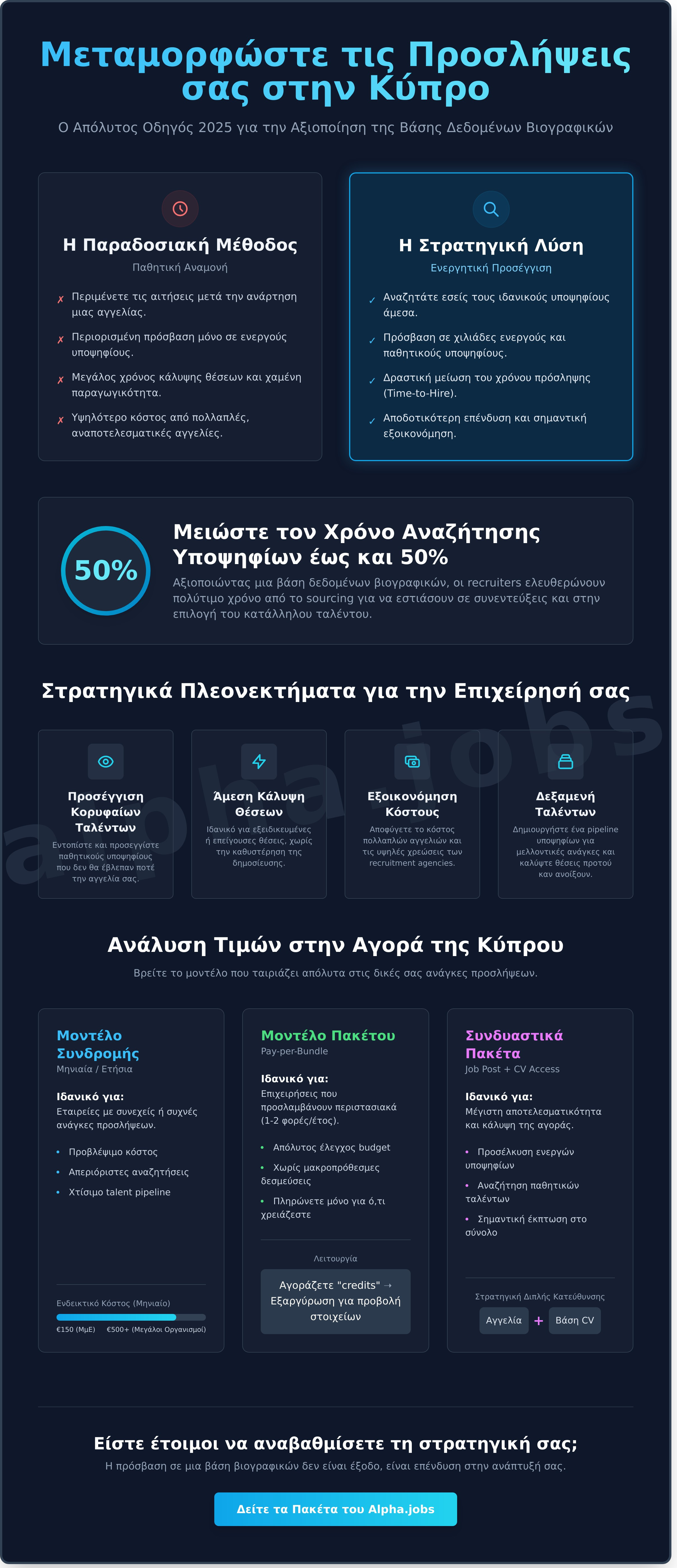 Η επιλογή της σωστής πλατφόρμας είναι στρατηγική απόφαση. Με το Alpha.jobs, δεν αποκτάτε απλώς πρόσβαση σε βιογραφικά· επενδύετε σε ένα ολοκληρωμένο εργαλείο που σας φέρνει πιο κοντά στους κατάλληλους ανθρώπους, γρηγορότερα από ποτέ. Η ανάλυση για τη δική μας βαση δεδομενων βιογραφικων κυπροσ τιμεσ και απόδοση δείχνει ξεκάθαρα γιατί είμαστε η #1 επιλογή για την εύρεση προσωπικού στην Κύπρο.